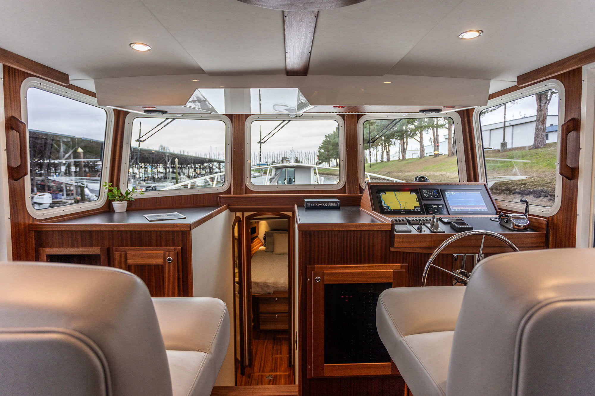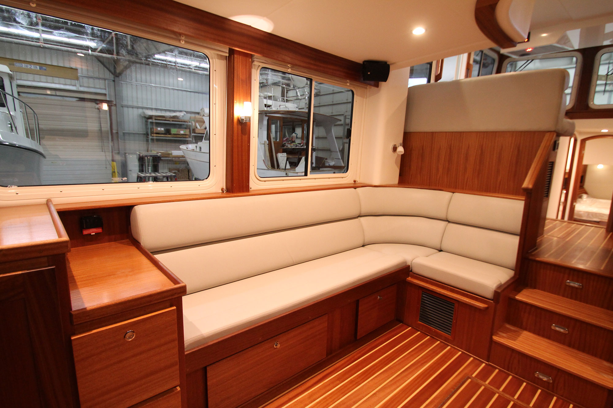 • Spacious, Thoughtful Layouts: A well-designed interior maximizes livable space. American Tug’s layouts provide open-concept salons with large windows, allowing for natural light and panoramic views and separate pilothouse designs that can serve as a secondary social area while on the hook.