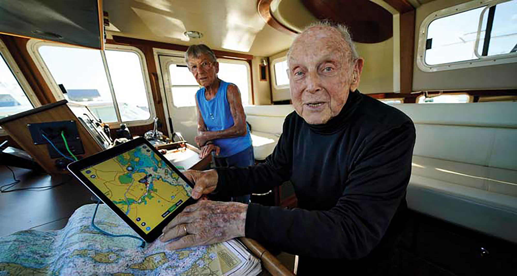 Earlier, the boat had left DiMillo’s Marina in Portland, skirting between islands in Casco Bay. Herb was at the helm and his wife, Ruth, stood next to him monitoring the course with an iPad. That’s not such a big deal for most boaters. But Herb will be 105 on October 4; Ruth is 97. They not only boat alone, they bought an even bigger boat over the summer.