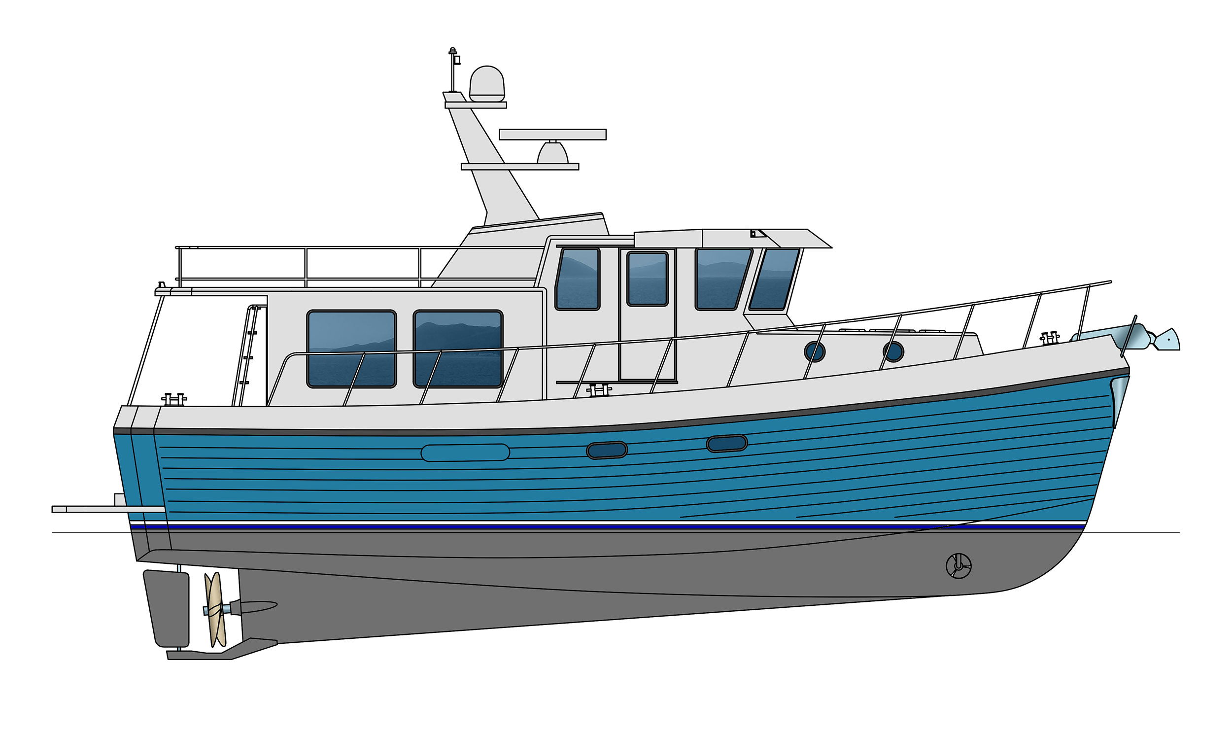 The American Tug semi-displacement hull allows for a range of cruising speeds, depending upon engine selection, and the full keel design provides true tracking throughout the speed range—in addition to increased stability at rest and underway.